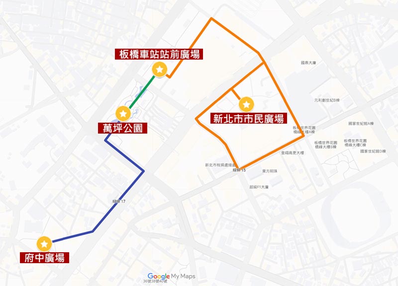 ⭐跑透透路線(橘色+綠色+藍色): ①新北市市民廣場 → 板橋車站車站前廣場 → 萬坪公園亮點有,LINE FRIENDS minini歡樂點心小鎮 → ④府中廣場亮點有,LINE FRIENDS冒險遊樂場/熊美耶誕城堡/歡樂摩天輪