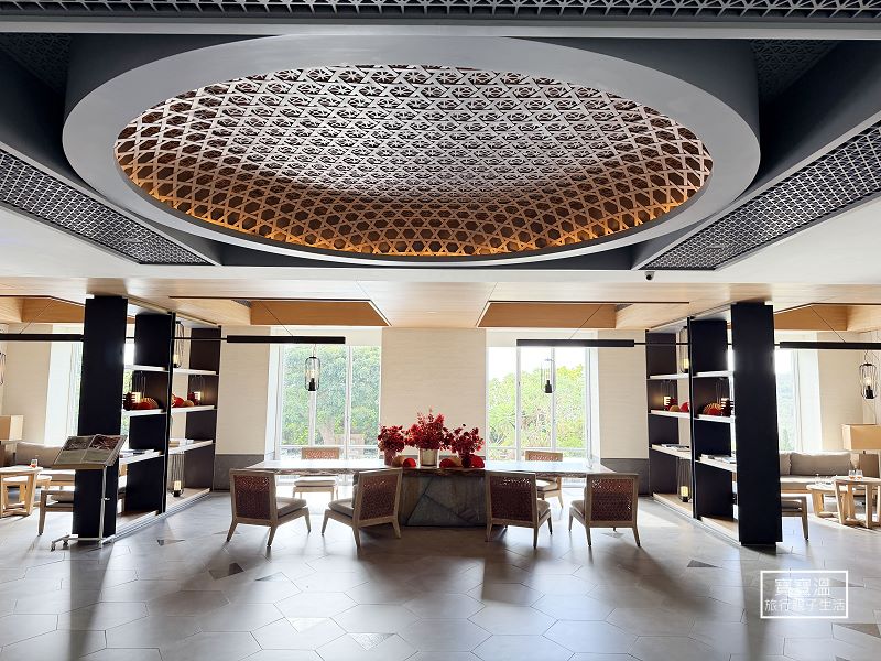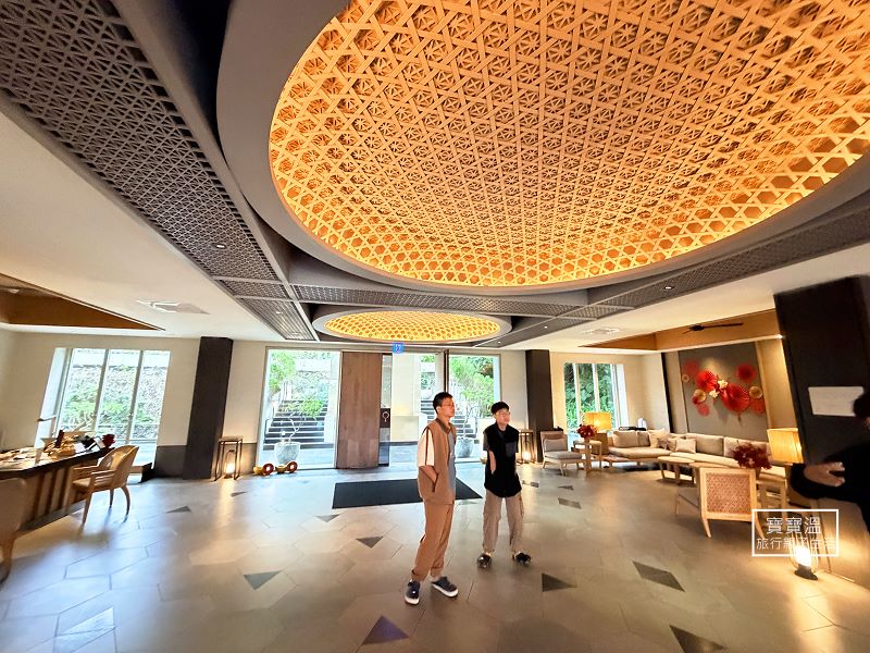▼走進大廳有種開闊的視覺感,天花板兩個超大的竹篩,是由六位老師傅親手編織而成,竹篩六角形結構象徵自然和諧,與地板的六角型磚相呼應