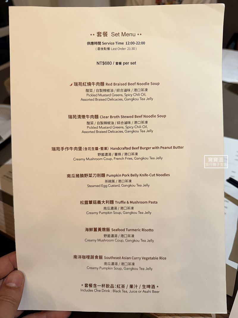 ▼套餐的菜單給大家參考,我們家吃的紅燒牛肉麵、南瓜豬腩野菜刀削麵、手作牛肉堡等都好好吃,另外也有單點菜單,也可以現場加購