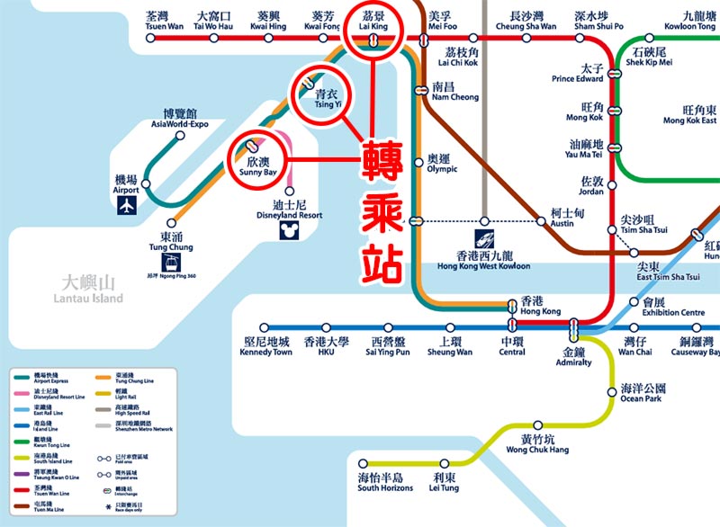 - 從機場也能直接到迪士尼,可以搭乘機場快線(綠色)到青衣站,再轉乘東涌線(橘色)到欣澳站