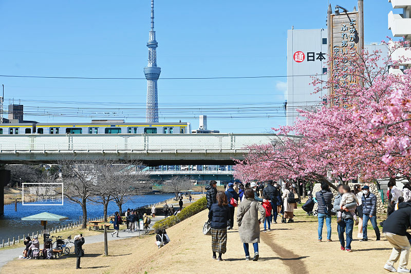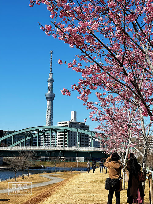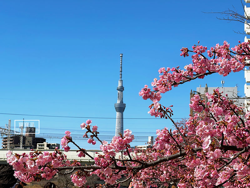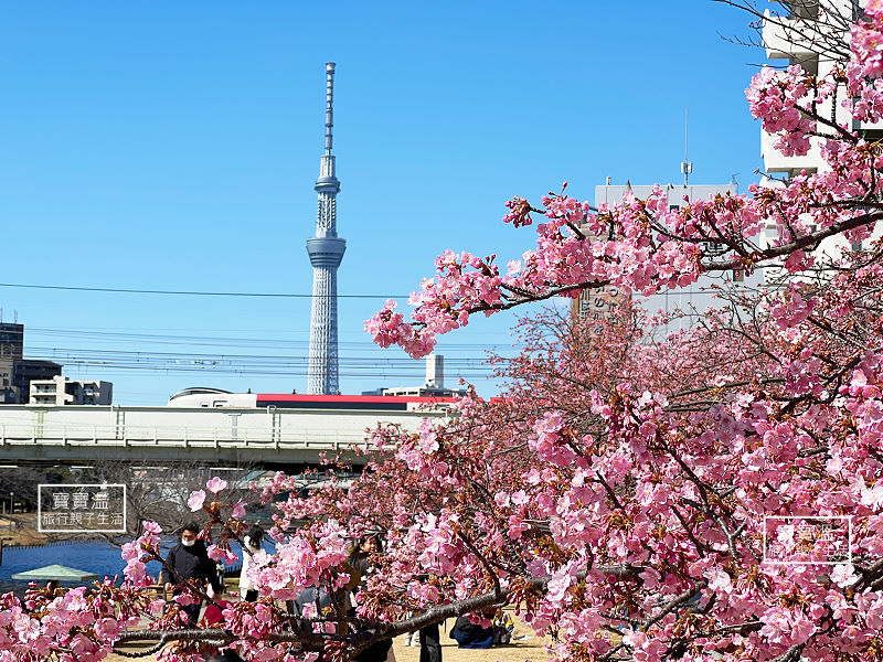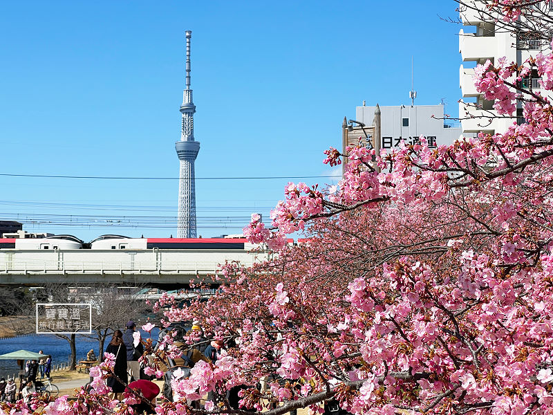 東京最早櫻花景點【舊中川河津櫻】晴空塔當背景, 櫻花絕景畫面這裡拍的到