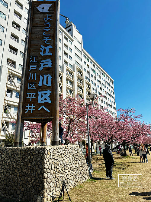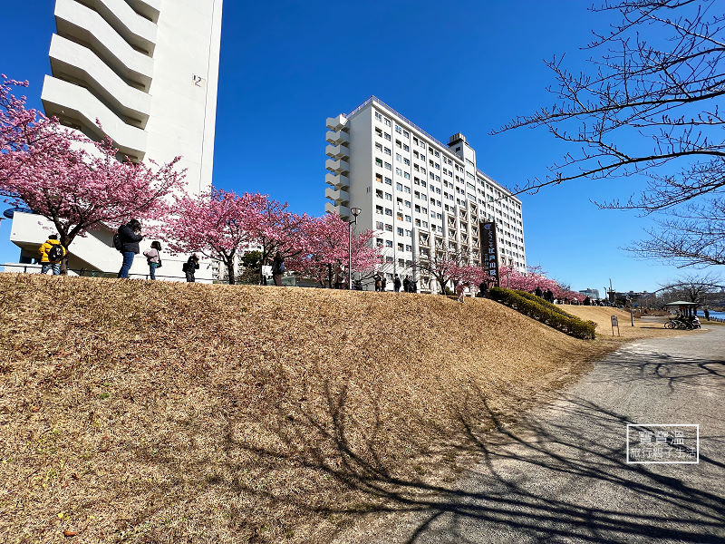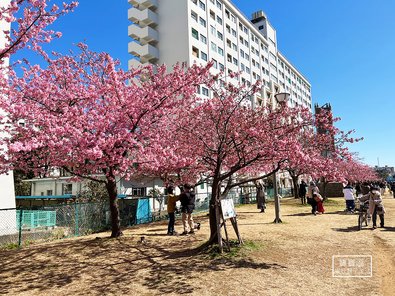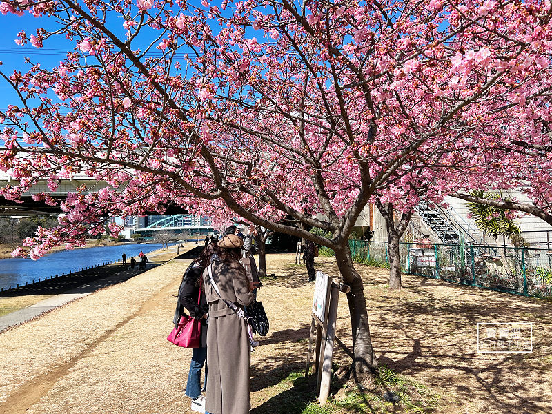 舊中川河津櫻被稱為東京最強河津櫻,除了地點方便外,就是這個景色,櫻花與晴空塔合影的絕景畫面,隨手就可以拍到