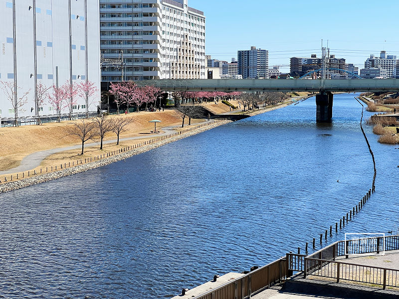 步行約10~15分鐘抵達舊中川賞櫻地點,從”江東新橋”上可以眺望河岸全景