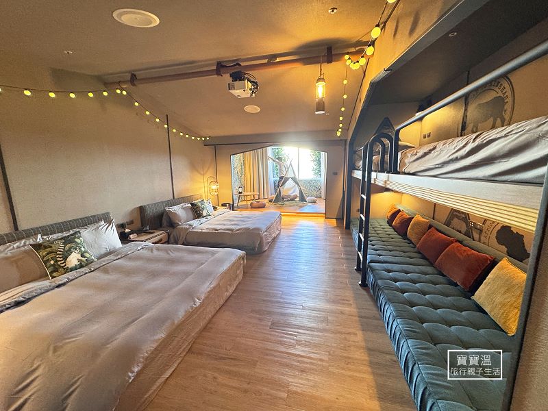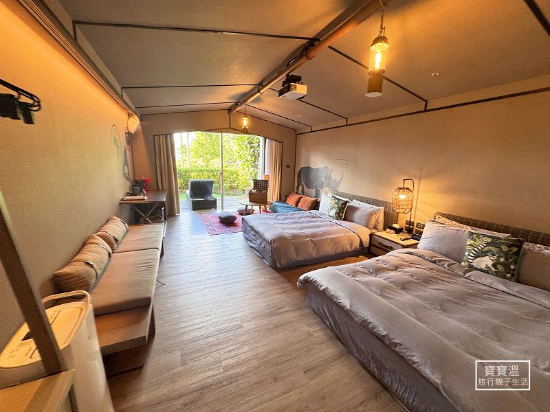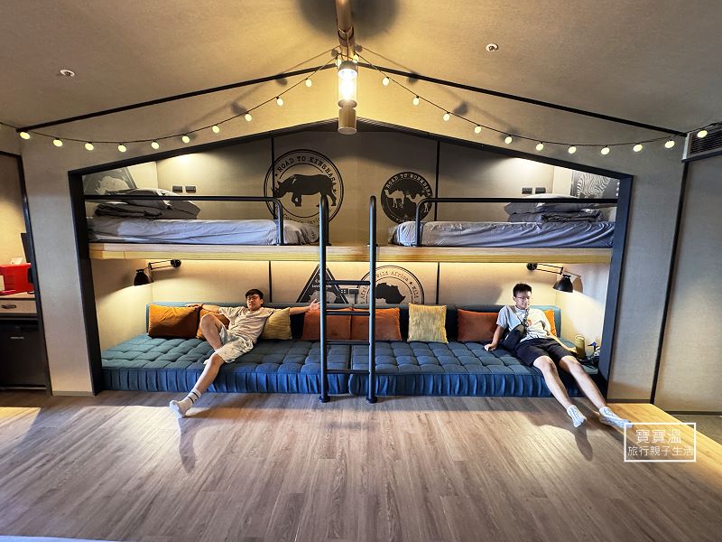 露營帳棚房型設計,寬敞房內空間,擁有上下舖床型,為每位成員打造舒適的住宿體驗;客房內的小角落更是休憩小天地,孩子們可在兒童小帳棚玩躲貓貓,家人或朋友們可躺坐舒適沙發上,共享歡樂的度假時光。