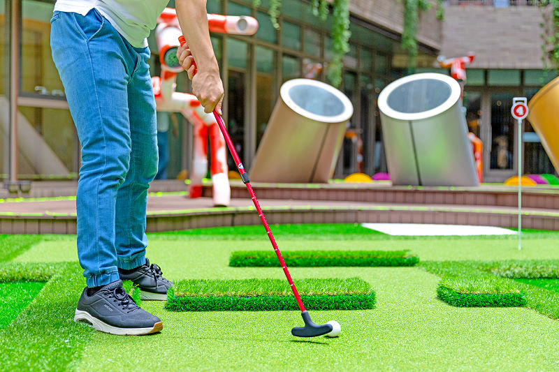 全新九洞的迷你高爾夫場地,在綠意環繞的中庭裡。不論是家人朋友間的較量、或想挑戰一桿進洞的快感,今天就來場刺激的對決吧。