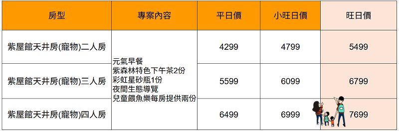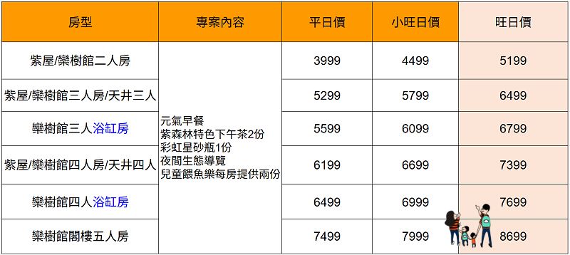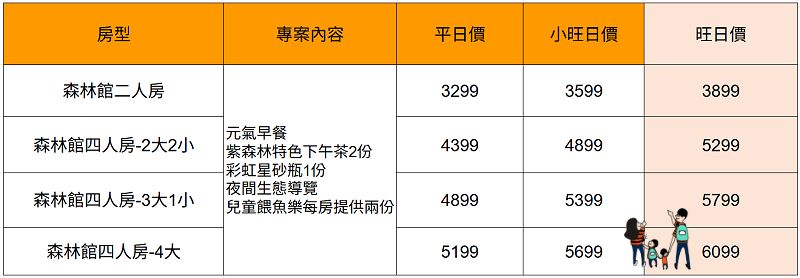 森林館四人房:第3位換12歲以上成人同住每位須加價$500/晚;第4位換12歲以上成人同住每位僅須加價$300/晚(表格的價格已包含)