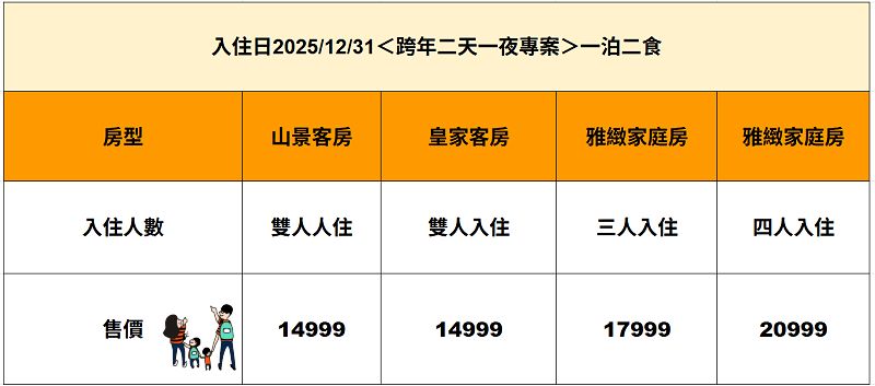 不適用日:2025/12/29-2026/01/01(12/31入住請選跨年方案)