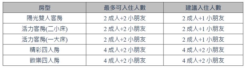 **建議人數及最多入住人數如表格,系統預設雙人房兩大、家庭房四大,未滿六歲可直接選人數,6-11歲孩童超過人數的小孩請用備註的,現場加價
