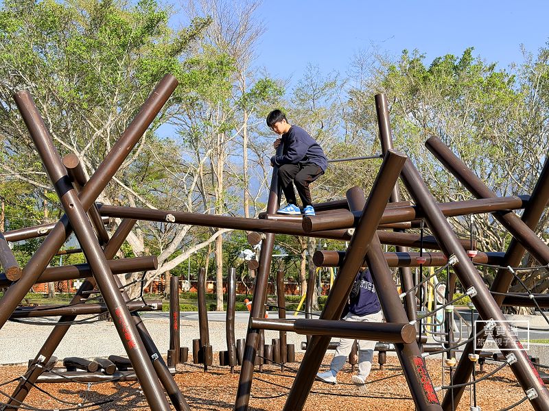 ▼如果你家的孩子年紀也比較大,那來背面挑戰,有兩層樓高的攀爬遊具,福寶兄弟HIGH起來了