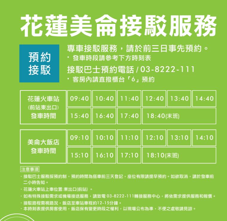 *花蓮火車站至飯店定時定點接駁服務(請事先預約,接駁時刻表依飯店公告為準)