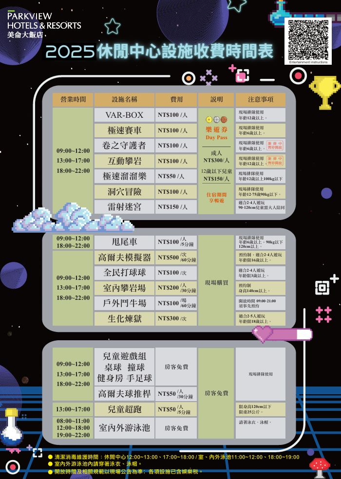 *飯店部分設施免費使用(游泳池、健身房、桌球及撞球);俱樂部開放項目、營業時間、活動*設施規範及收費內容依飯店現場公告為準