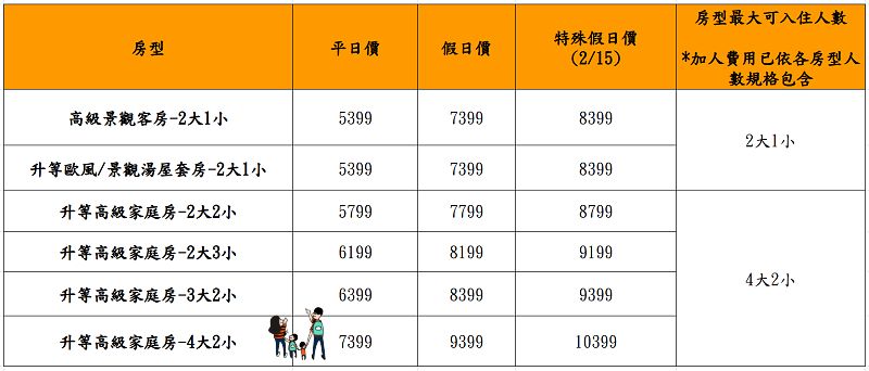 “*不分成人兒童加床費用每房每晚NT$1760/位;僅歐風套房 & 高級家庭房可加1床(數量有限,須依需求後回覆為主)’