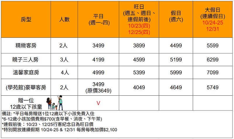 - 國定假日:12/25 (旺日價)、1/1元旦(同假日周六價)