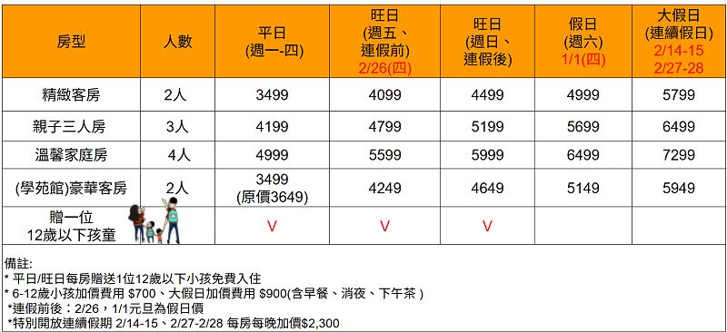 2026年6~12歲每人每晚平、旺、假日加價$700;大假日加價$900(皆含早餐、消夜及下午茶)。