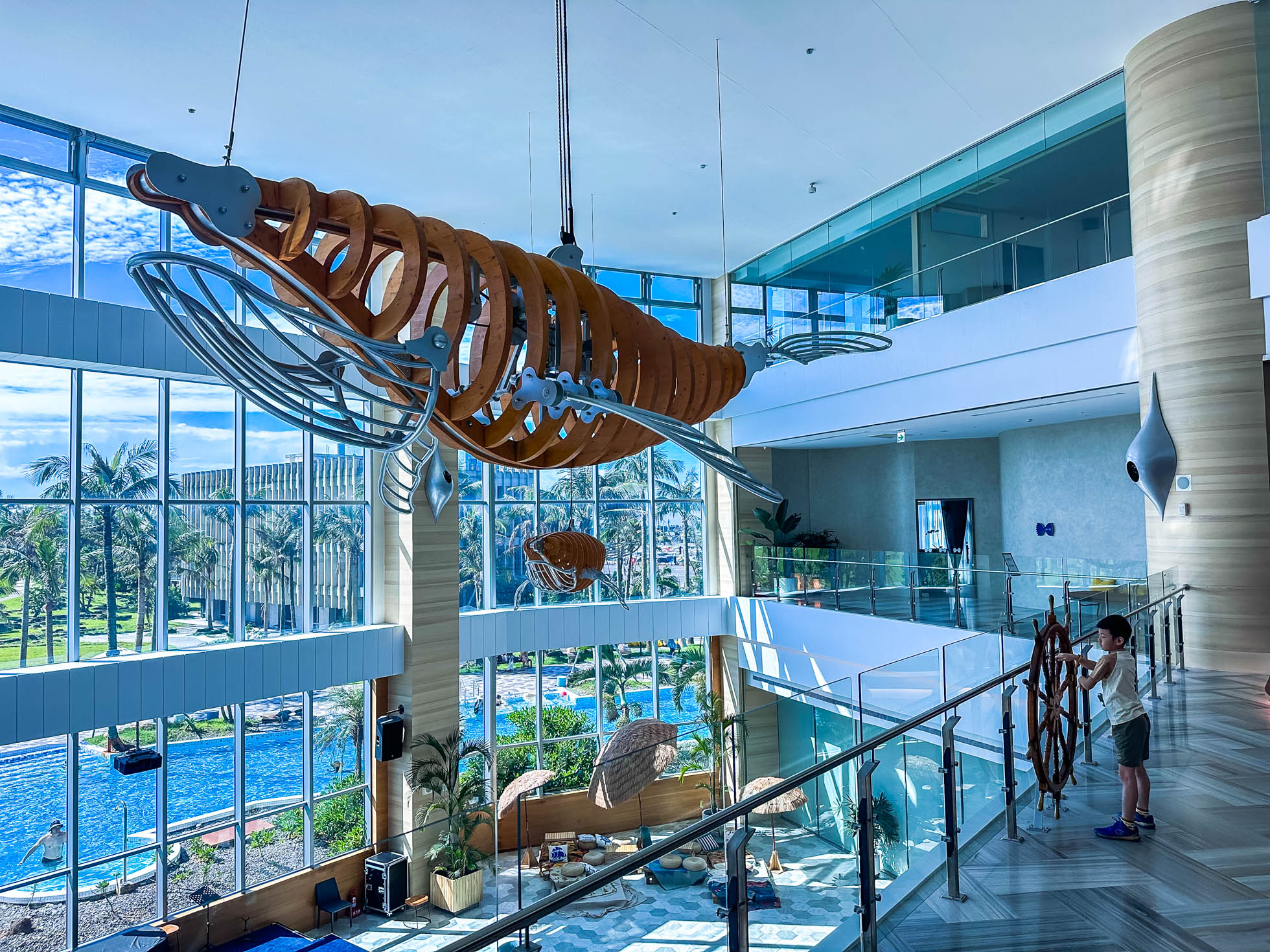 ▼凱渡廣場酒店不只外觀像遊輪,走進內部也是滿滿的海洋元素,辦理入住的櫃檯是船泊造型,挑高的大廳有兩隻母子鯨魚,每半小時會動起來,伴隨著音樂及燈光投影,讓人彷彿置身於大海之中