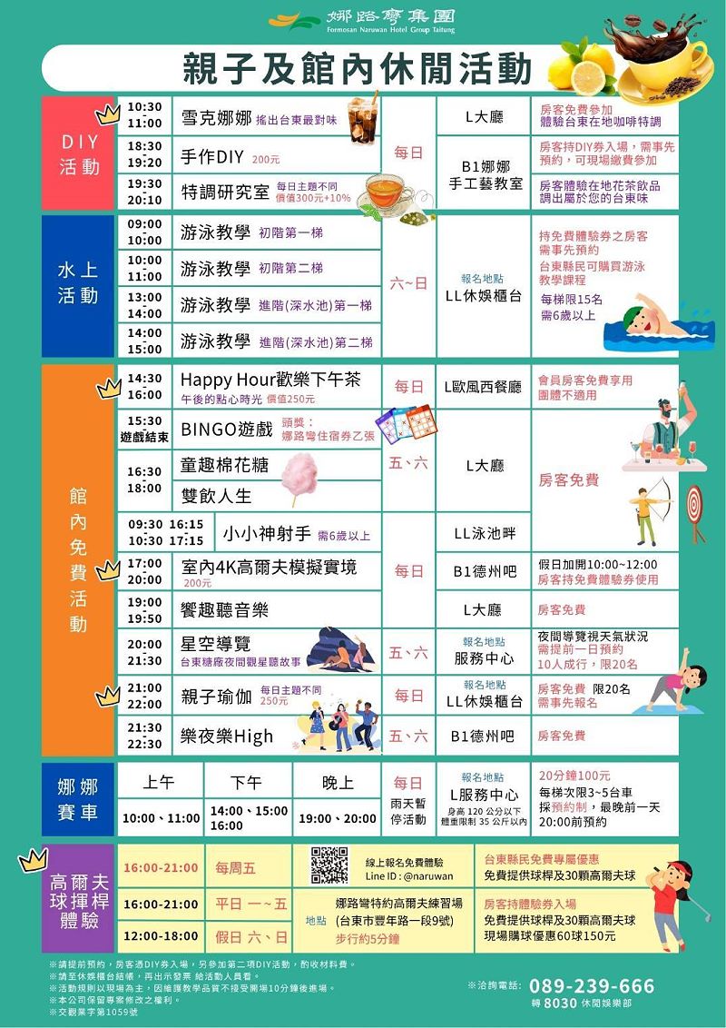 附上親子及館內休閒活動時間表(飯店依時令調整活動內容,正確內容依官網公告為主)