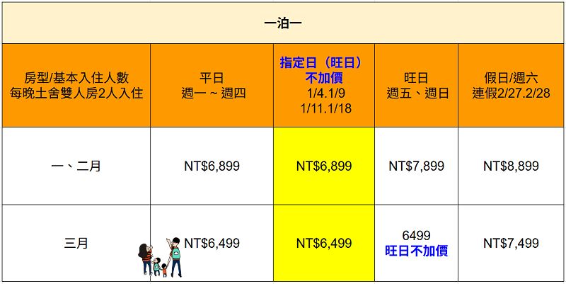 ★基本入住2人,加人入住加價,不分成人或兒童,土舍最多3人+1幼入住,水舍最多5人+1幼入住,0~3歲不佔床幼童可加1位(超出專案人數請現場加價)