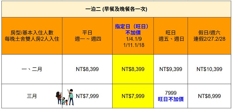 🎁平日(週一~週四)每房加贈1位成人或小孩入住(含床墊、早餐)