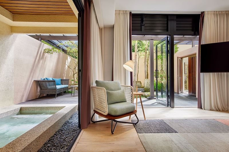 隱身樹林花叢間,擁有雙面大型觀景落地窗,包含私人專屬花園及Jacuzzi 按摩浴池,擁有寬敞專屬的度假空間。