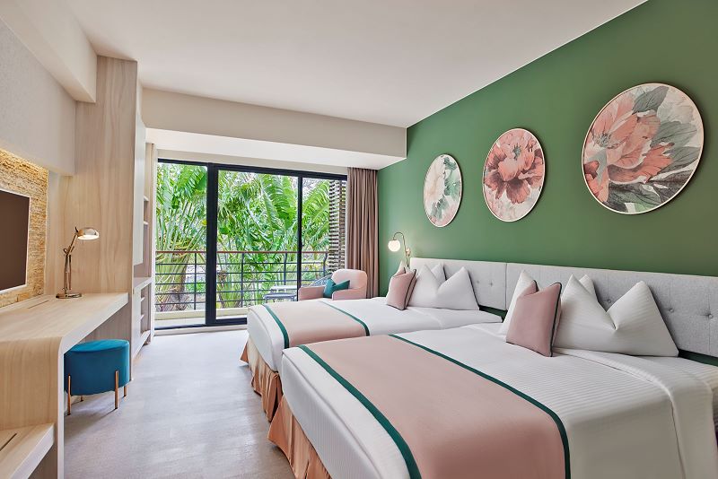 CP值最高的景觀客房兩大床,用藍綠色系搭配各式畫框,再結合最具質感的木質與金屬元素,所打造的房型,小家庭入住最適合