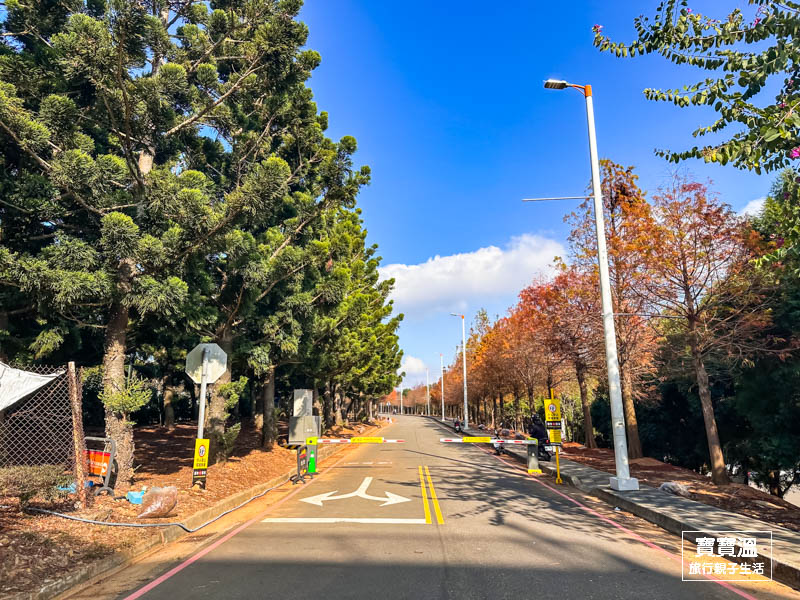 ▼沿著月眉南路往麗寶國際賽車場的方向走,就能看到落羽松大道,經由步行方向就能進到大道欣賞落羽松