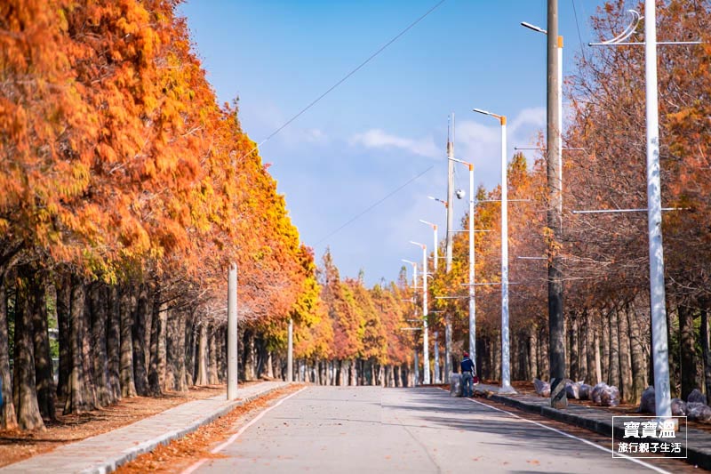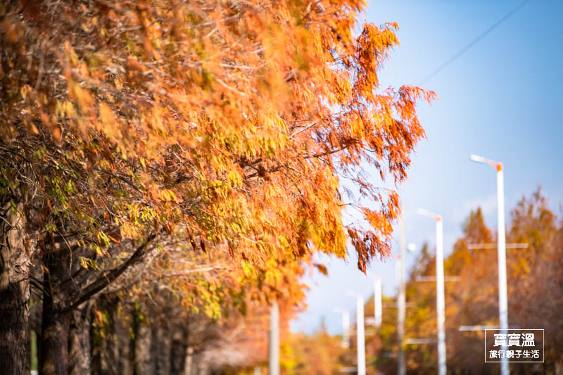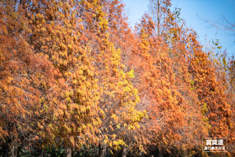 ▼呈金黃色帶有點橘紅色的落羽松,是最美麗的時刻,也喜歡追落羽松的人,麗寶樂園旁的落羽松秘境大道,趁著好天氣馬上追起來