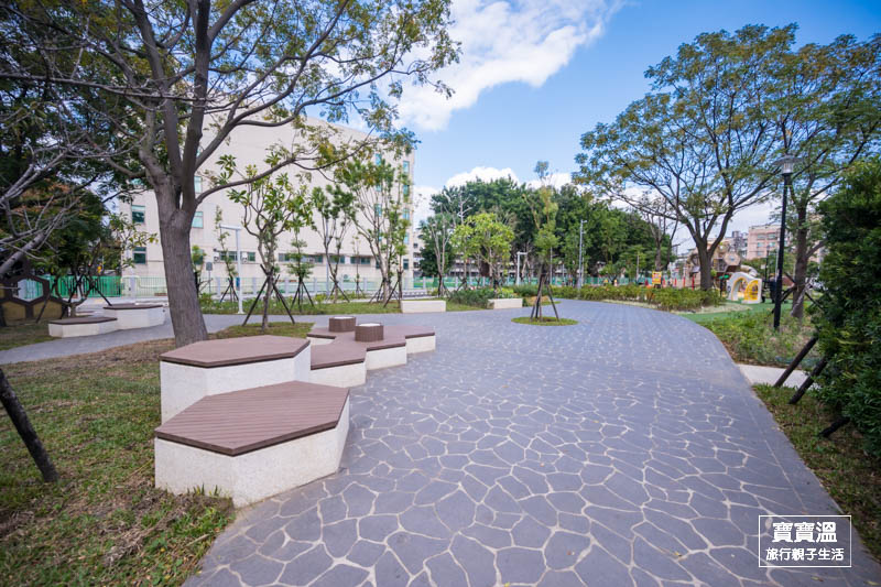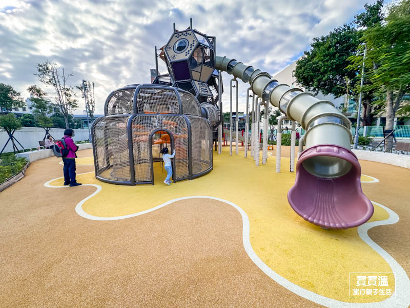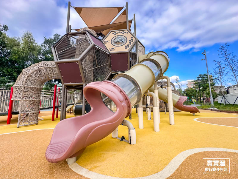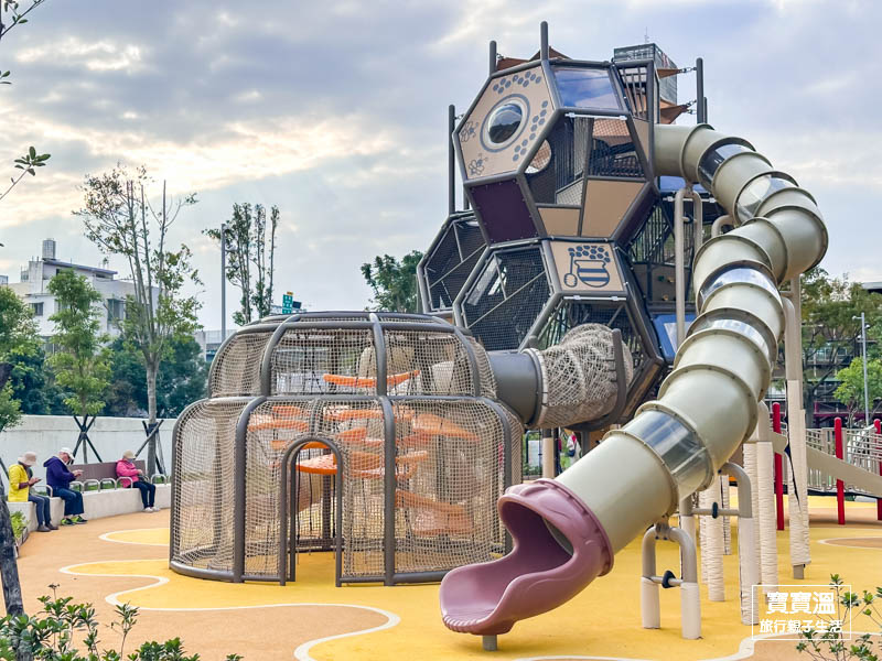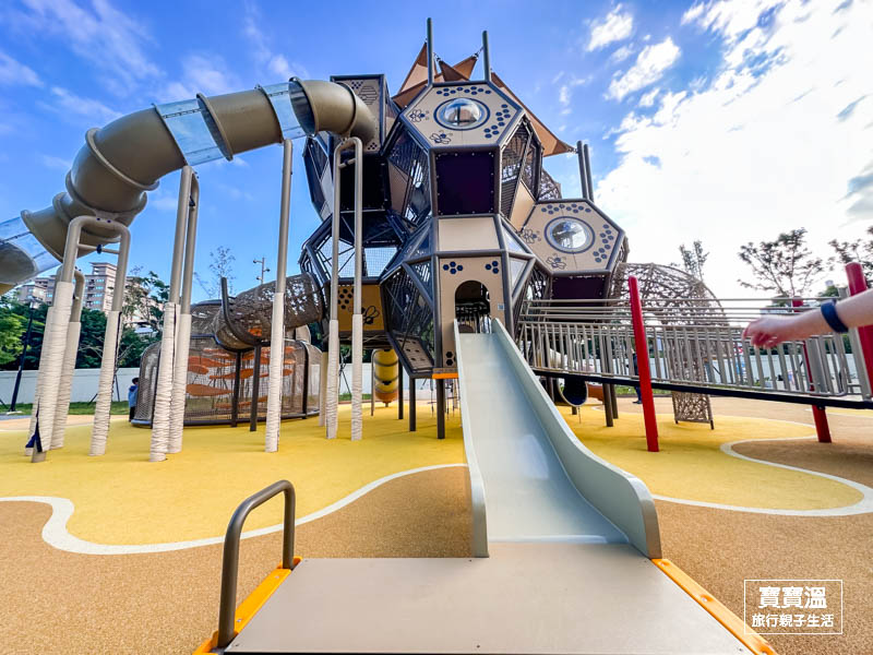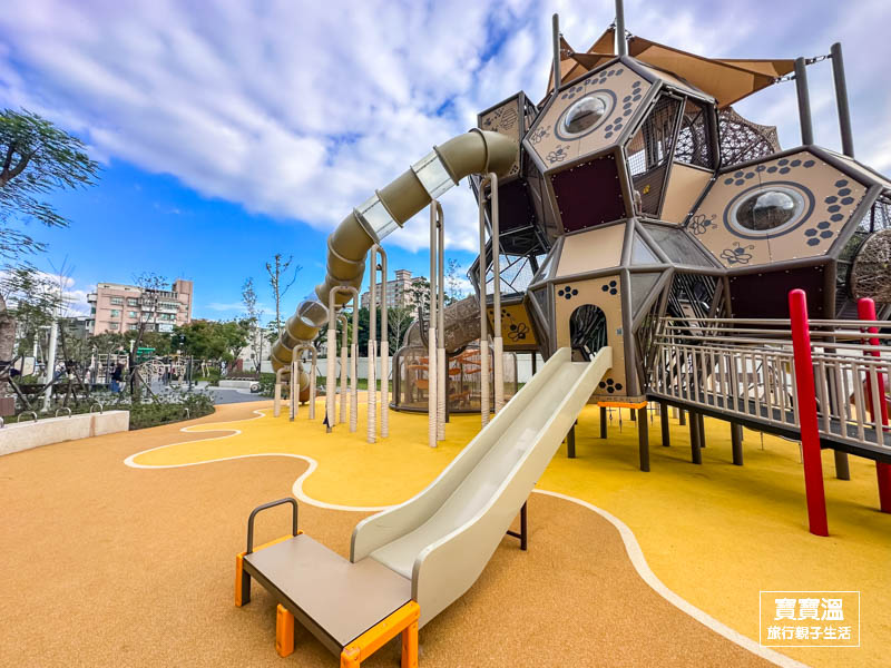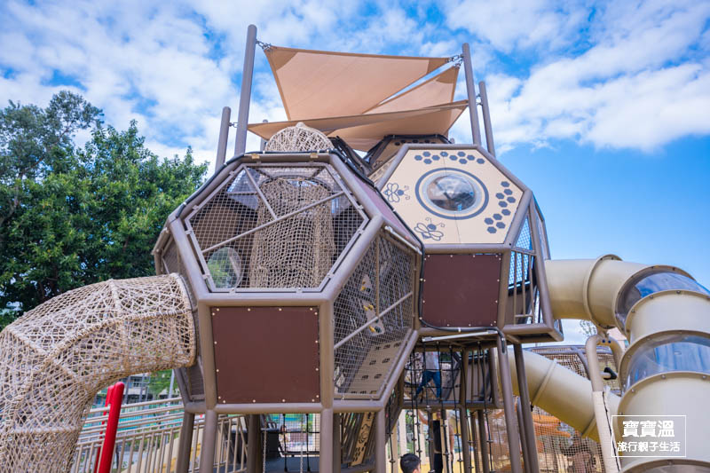 玩起來會很HAPPY的快樂公園,一走進來就能看到又高又大的蜂巢造型組合遊具,主要可以玩到三道適合不同年齡層的溜滑梯和攀爬設施,呈現六角形造的蜂巢造型真的挺可愛