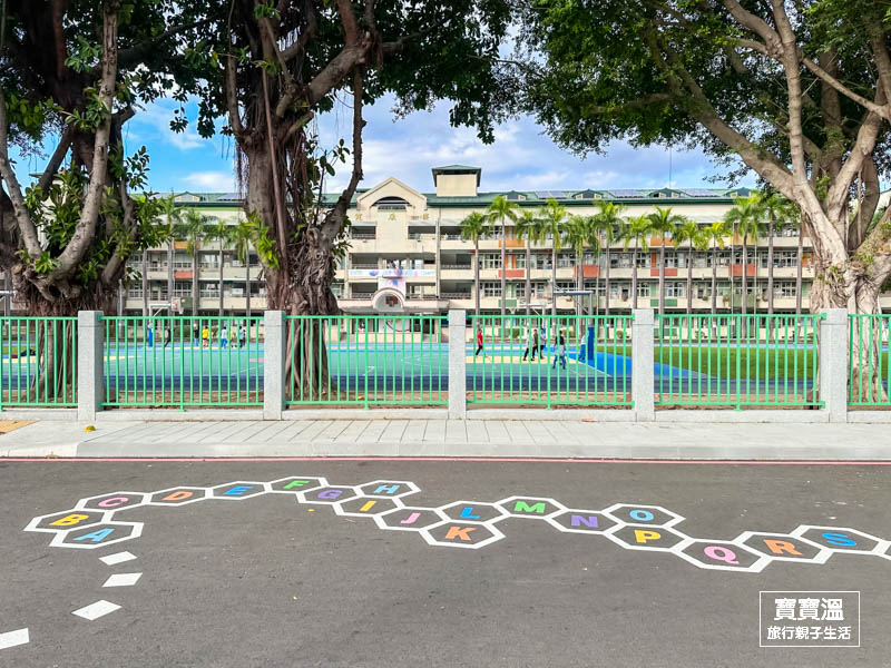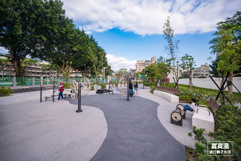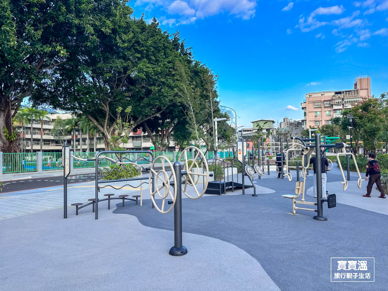 快樂公園和豐年國小間的走道也是遊玩的空間,可以跟著地上的彩繪玩跳格子,也有大人專屬的體健設施