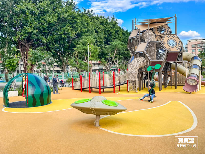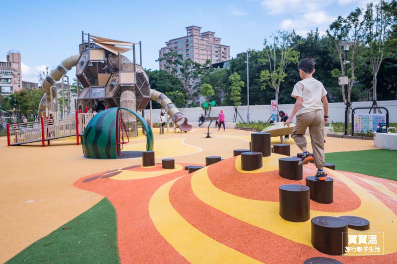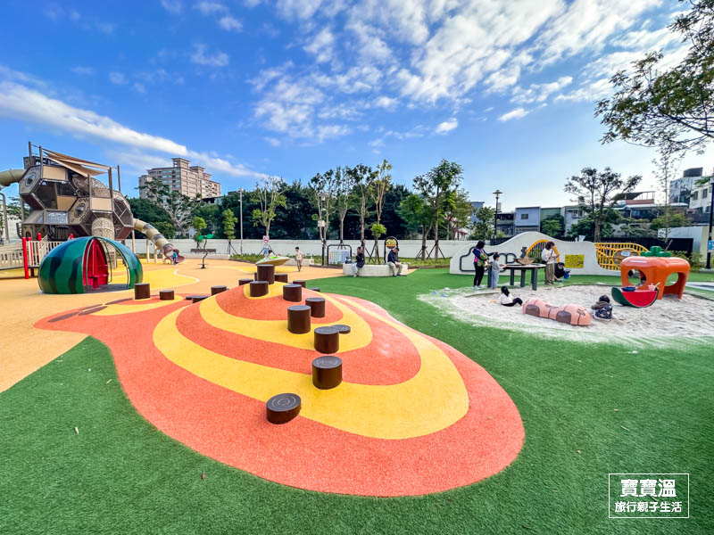 快樂公園除了好玩的蜂巢組合遊具,周邊的西瓜旋轉盤和蔬菜大沙坑也很受小朋友歡迎,還有小山坡木樁可以訓練平衡,光是看吸晴的造型連寶寶溫都想玩