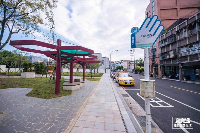 搭乘公車的人,①搭乘F201、F206、橘22 ②在「豐年國小」下車 → ③步行不用一分鐘抵達公園