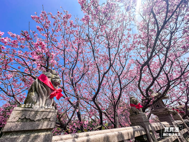 ▼有粉嫩的櫻花當背景,石獅都變得可愛了