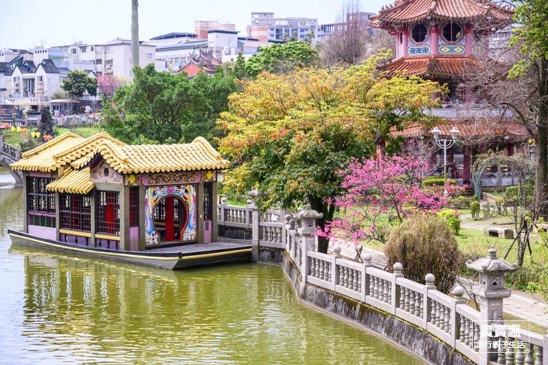 拍完古色古色香寺廟前的櫻花,過個馬路繼續到竹林山寺公園賞花,這裡有沿溪兩側的賞花步道,有涼亭、山洞、神話故事角色的造景,就算不是花期也是個散步的好地方,過年期間還會掛上燈籠,整個過年氣氛直奔最高點