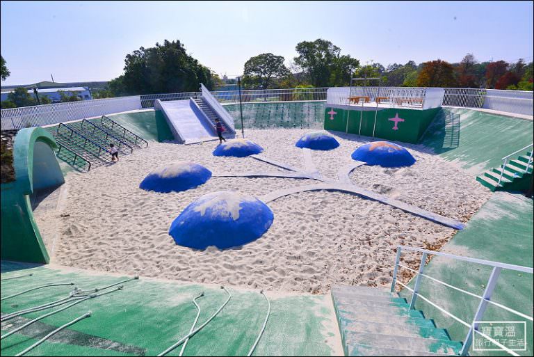 ▼ 台中的特色公園都好流行大沙坑,像最新的文心森林公園12感官遊戲體驗區,根本就整個公園建在沙坑上,圳前仁愛公園也不遑多讓,所有設施環繞著機堡中央沙池,爬上爬上都在這個沙坑裡