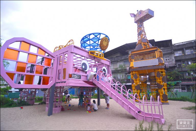▼ 要進入讓孩子尖叫的區域了,高11公尺的長頸鹿高,改造自巴士的巨無霸大象溜滑梯,寬廣的戲沙池,真的太好玩了